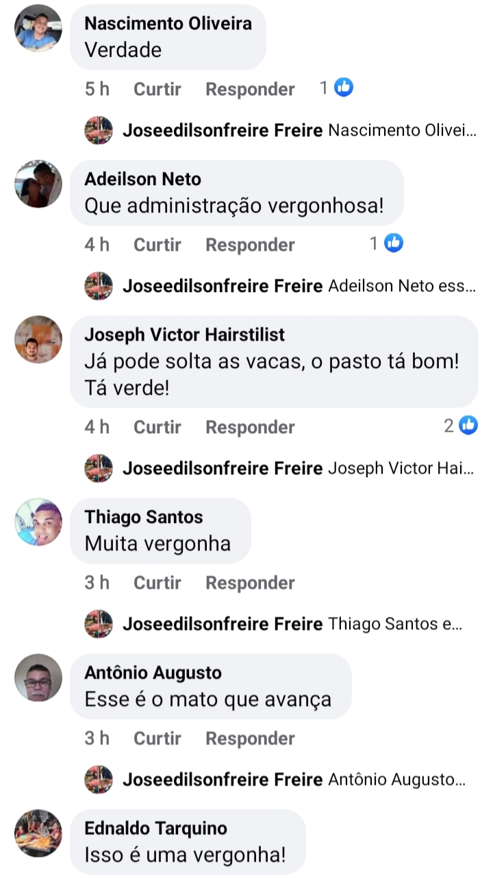 Outro internauta criticou a atual administração e disse que os problemas nos serviços públicos atingem outras áreas do município. “Descaso com a população, essa administração vive só de aparências”.