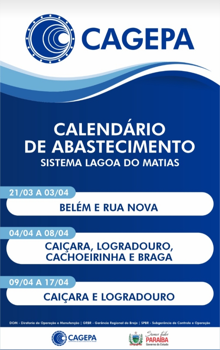 A Companhia de Água e Esgotos da Paraíba (Cagepa), anunciou no início da tarde desta segunda-feira (21) o novo cronograma de abastecimento para as cidades e distritos abastecidos pelo manancial Lagoa do Matias.