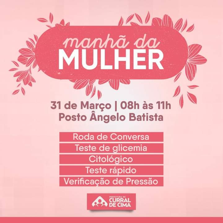 Para fechar o mês das mulheres com chave de ouro, a Prefeitura de Curral de Cima, através da Secretaria de Saúde e Assistência Social, está programando um dia repleto de ações para ‘Elas’.