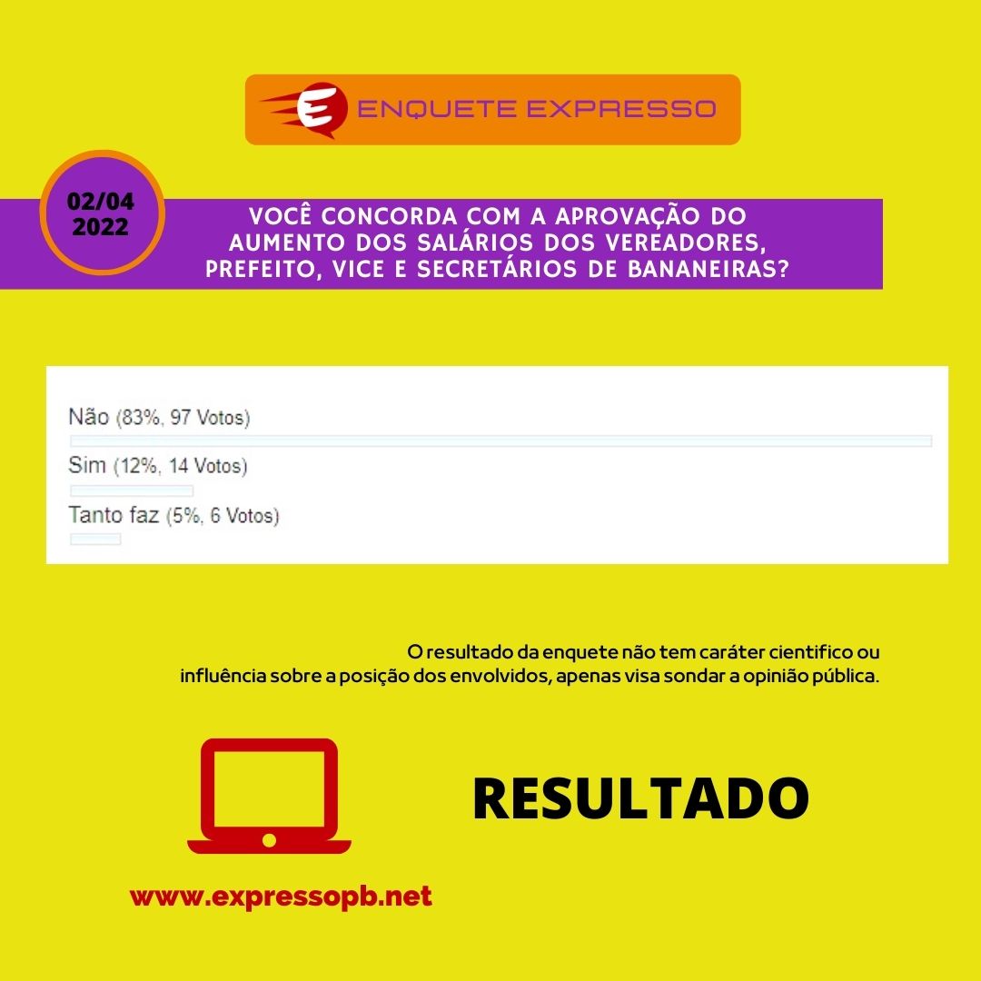 O aumento de salários do prefeito, do vice, dos secretários e dos vereadores foi reprovada pela maioria dos internautas que participaram da enquete rápida realizada pelo ExpressoPB.net com o intuito de saber a opinião de seus leitores.