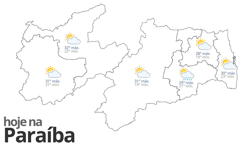 O padrão da configuração de ventos nos altos e médios níveis da atmosfera, no dia de hoje, está contribuindo para a condição de nebulosidade variável em grande parte do estado da Paraíba. Com isso, poderão ocorrer chuvas pontuais ao longo do dia. As temperaturas máximas registradas na tarde de ontem em Areia; 28,4C, Cabaceiras; 33,3C, Campina Grande; 29,6C, João Pessoa; 32,3C, Monteiro; 32,0C e São Gonçalo; 33,5C e, as mínimas registradas na madrugada de hoje em Areia; 21,6C, Cabaceiras; 22,7C, Campina Grande; 22,3C, João Pessoa; 24,8C, Monteiro; 20,9C e São Gonçalo; 23,2C.