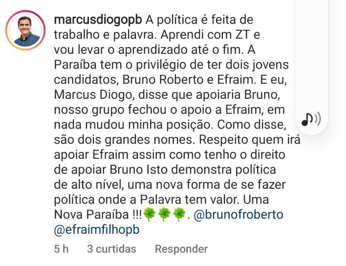 “A política é feita de trabalho e palavra. Aprendi com ZT e vou levar o aprendizado até o fim…”, disse Marcus para reafirmar seu apoio a Bruno mesmo que o grupo capitaneado pela deputada Camila e a ex-prefeita Lea tenham decidido votar com Efraim Filho.