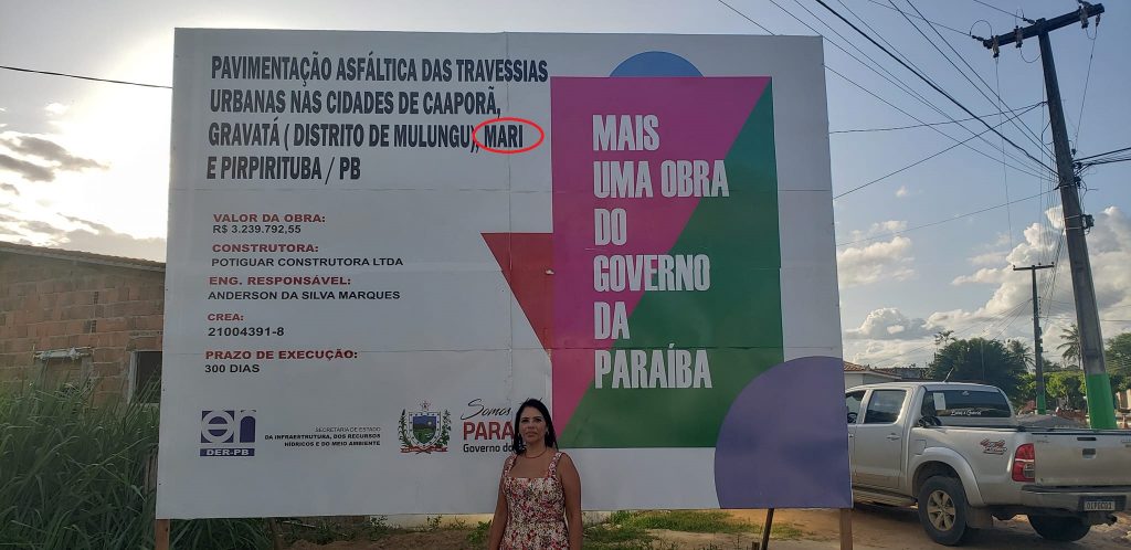 Placa com anúncio da travessia urbana de Mari é exposta no Distrito de Gravatá de Mulungu onde obras já começaram