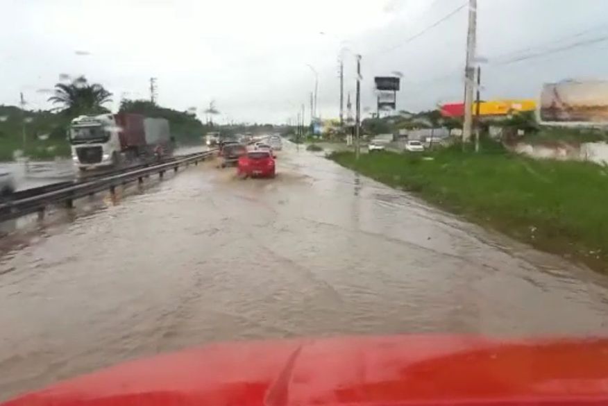 O trânsito ficou lento na rodovia, na divisa entre Bayeux e João Pessoa. As duas faixas de fluxo no sentido Bayeux/João Pessoa ficaram tomadas pela água.