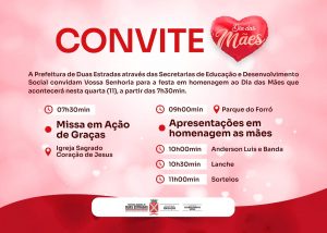 A Prefeitura de Duas Estradas, no Agreste da Paraíba, vai realizar um evento em homenagem ao Dia das Mães. A programação vai acontecer na quarta-feira (11), no Centro de Lazer e Eventos, Parque do Forró.