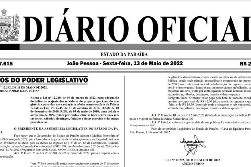 Na edição desta sexta-feira (13) do Diário Oficial do Estado da Paraíba foi publicada a Lei 12.292, que adequa o índice de reajuste do Magistério. De acordo a Lei promulgada, o reajuste é de 33,24%. O reajuste no Piso Salarial foi anunciado previamente em janeiro pelo presidente da República, Jair Bolsonaro.