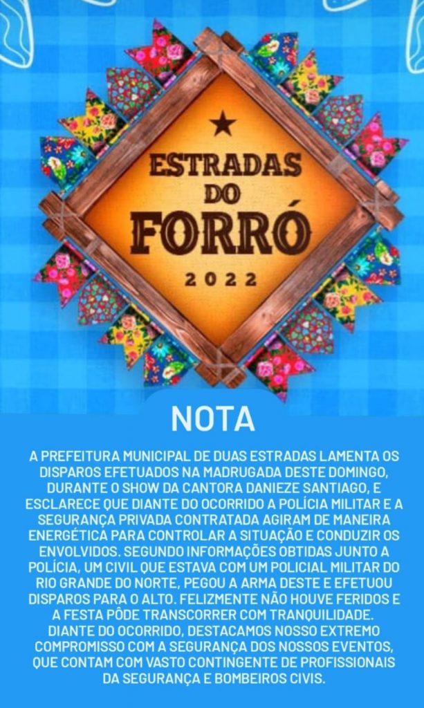 NOTA: Prefeitura de Duas Estradas lamenta por disparos ocorrido durante evento junino