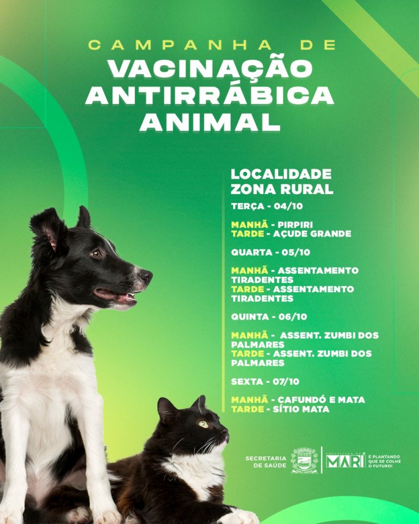 Confira o cronograma de vacinação Antirrábica na Zona Rural de Mari, para os dias 4, 5, 6 e 7 de outubro