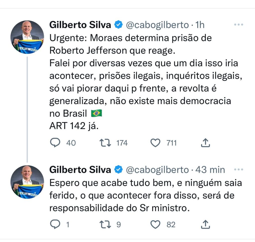 Poucos minutos depois, ele apagou a postagem. Após Roberto Jefferson se entregar à PF, Cabo Gilberto retweetou um vídeo de Carla Zambelli no qual o presidente Jair Bolsonaro (PL) chama o ex-deputado federal de “bandido”.