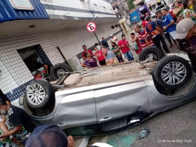 Carro avança cruzamento, é atingido e capota no centro de Guarabira