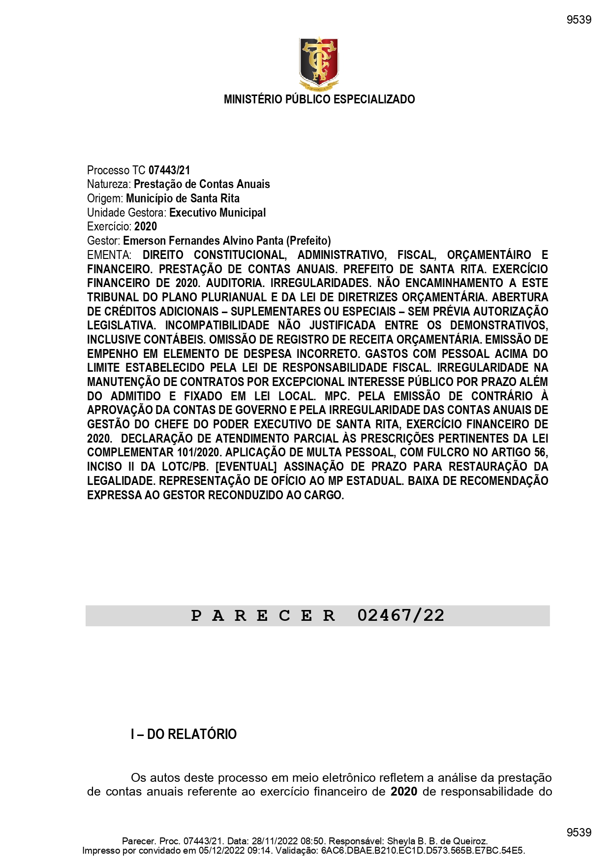 Um relatório elaborado pelo Ministério Público de Contas da Paraíba apontou diversas irregularidades na prestação de contas anual do município de Santa Rita, região metropolitana de João Pessoa, referente a 2020. Conforme apurou o ClickPB, foi emitida a recomendação contrária à aprovação de contas do prefeito Emerson Panta relativas ao período, além da aplicação de multa.