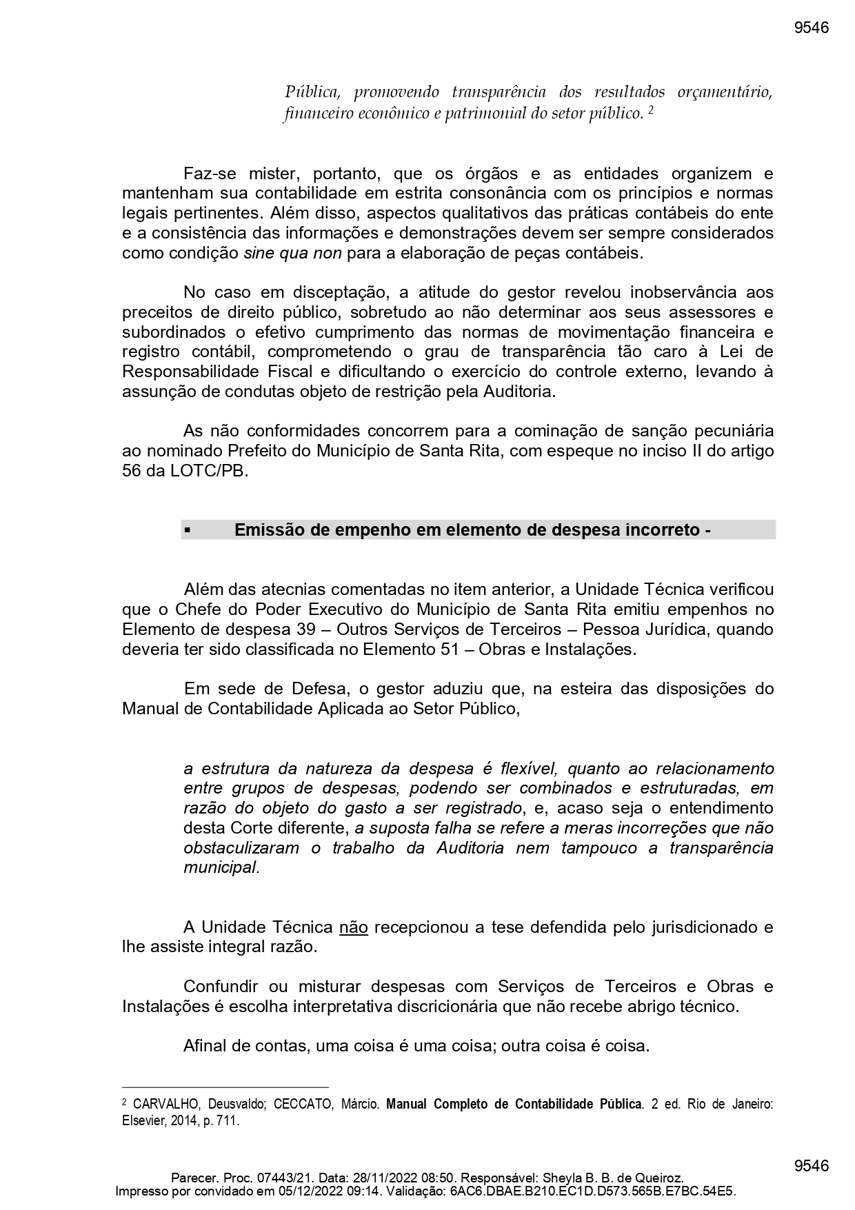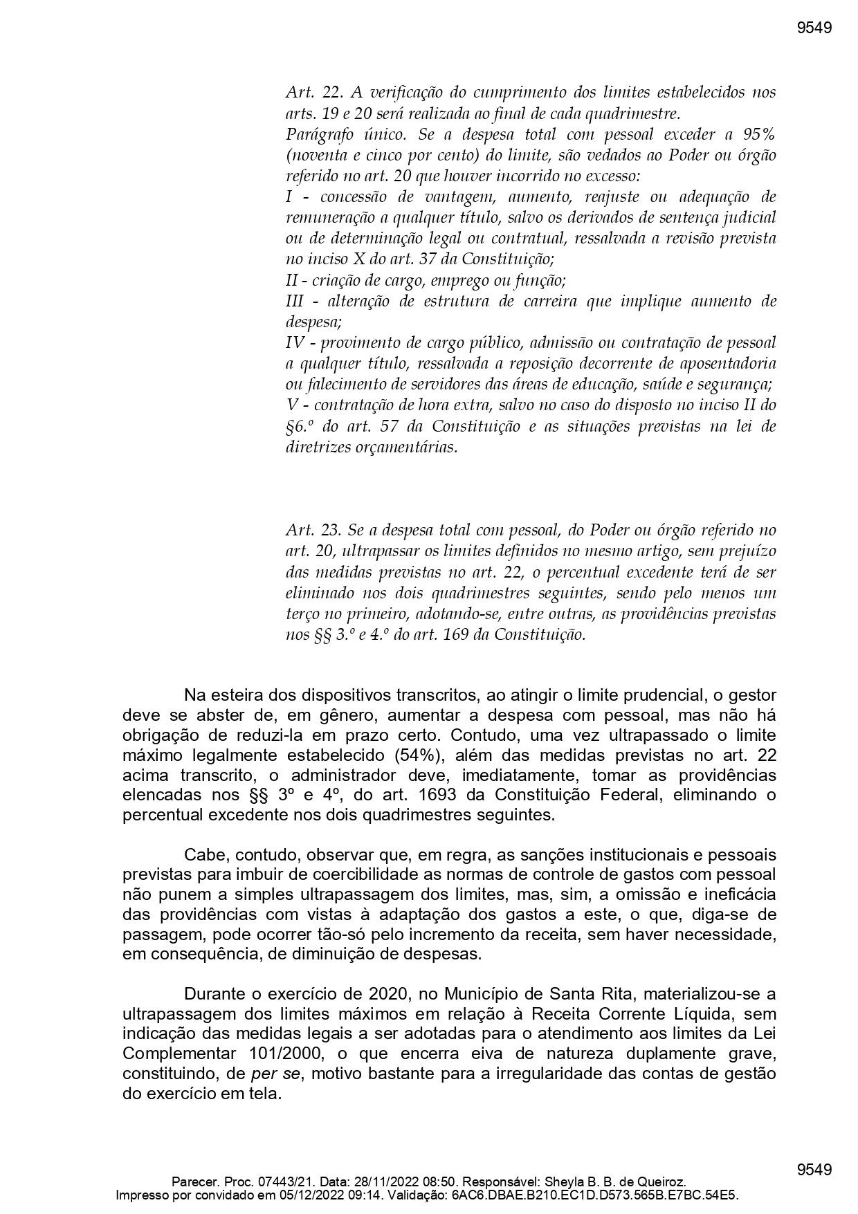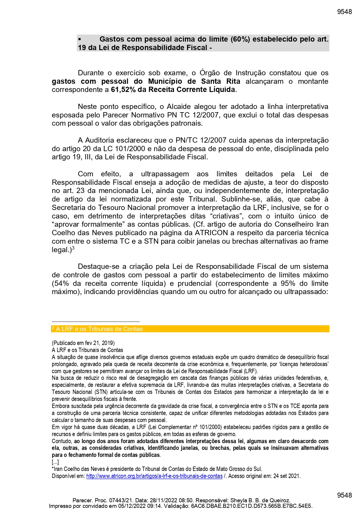 “Durante o exercício sob exame, o Órgão de Instrução constatou que os gastos com pessoal do Município de Santa Rita alcançaram o montante correspondente a 61,52% da Receita Corrente Líquida”. De acordo com a auditoria, sobre este caso em específico, a administração alegou ter adotado um interpretação que exclui Neste ponto específico, o Alcaide alegou ter adotado a linha interpretativa que exclui o total das despesas com pessoal o valor das obrigações patronais. Porém, o MP lembrou que esta análise não é cabível na despesa de pessoal da prefeitura, conforme Lei de Responsabilidade Fiscal.