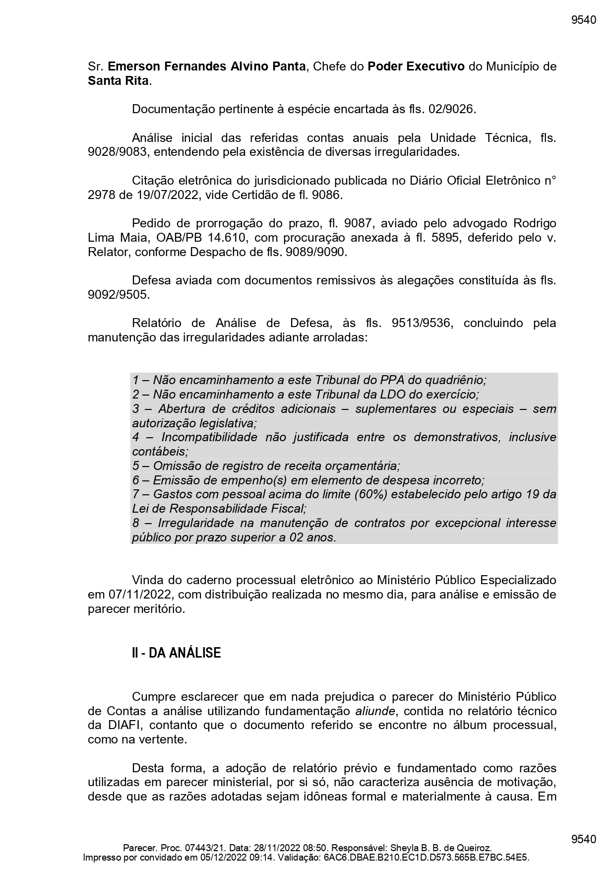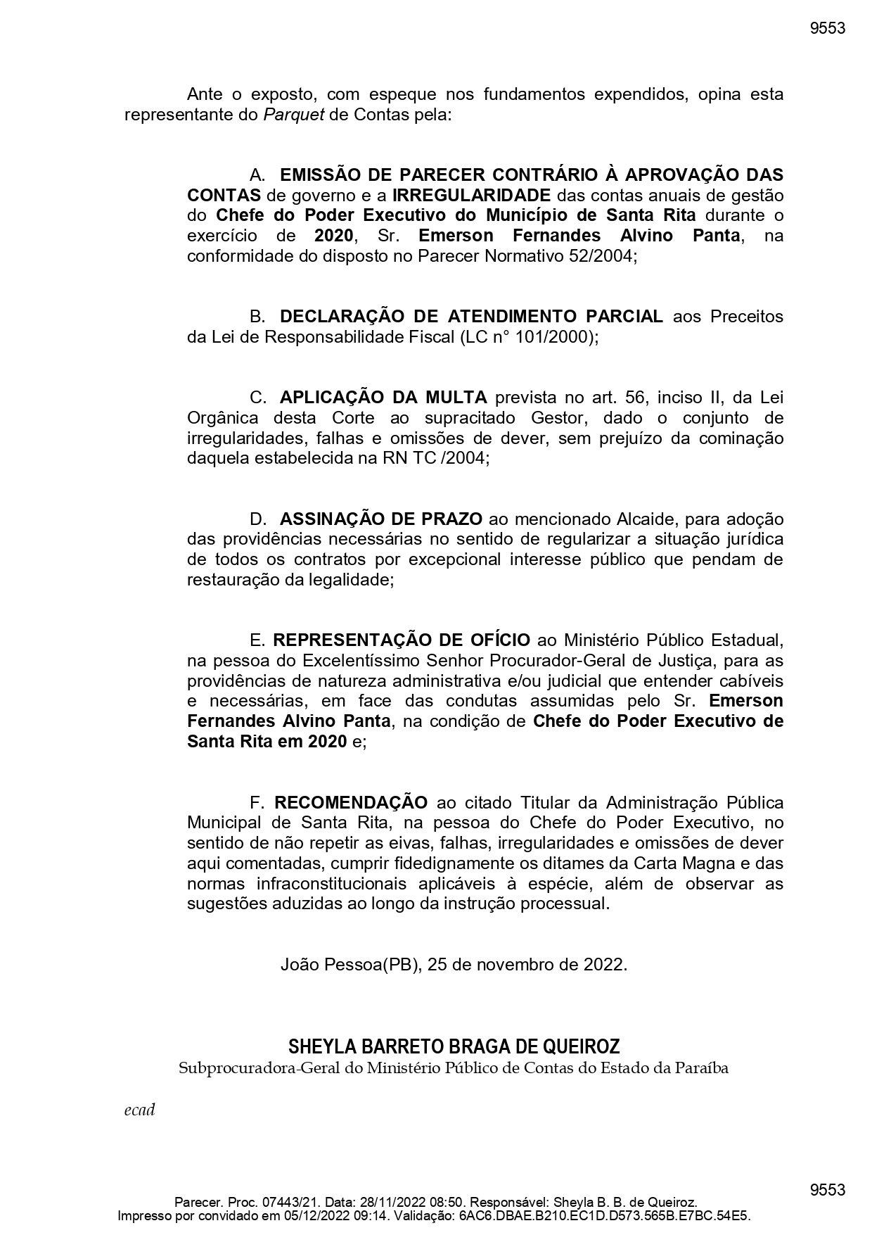 O material, com cerca de 40 páginas, é assinado pela subprocuradora-geral Sheyla Barreto. Ele trouxe, por exemplo, que as despesas com pessoal e encargos por parte da prefeitura de Santa Rita alcançaram o percentual de 61,52%, ou seja, ‘furando’ o teto de 60%.