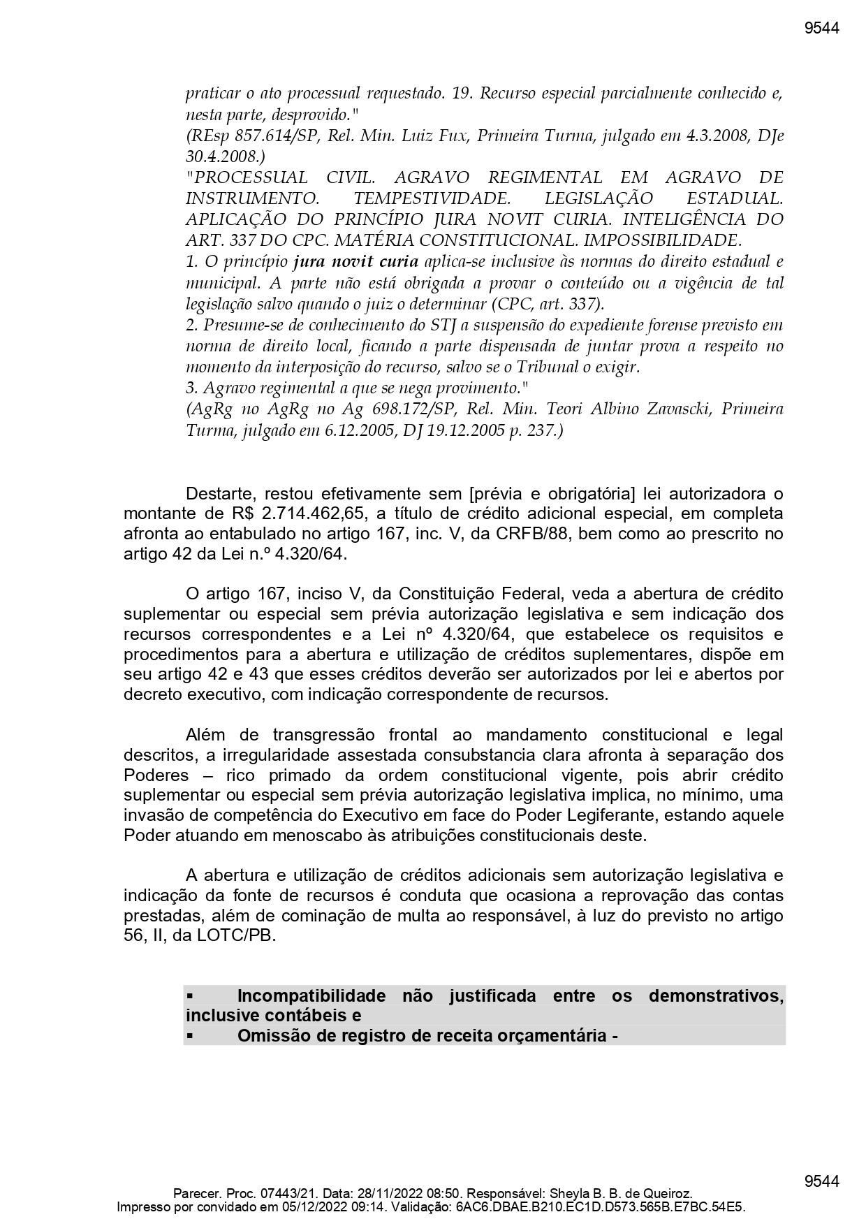 Porém, o MP disse que a lei citada pela defesa da gestão “não consta nos anexos da defesa apresentada pelo gestor. Portanto, entende-se pela manutenção da irregularidade”. Segundo apurou o ClickPB, no relatório constam como créditos orçamentários sem autorização R$ 2.714.462,65, no âmbito de ‘créditos especiais’.