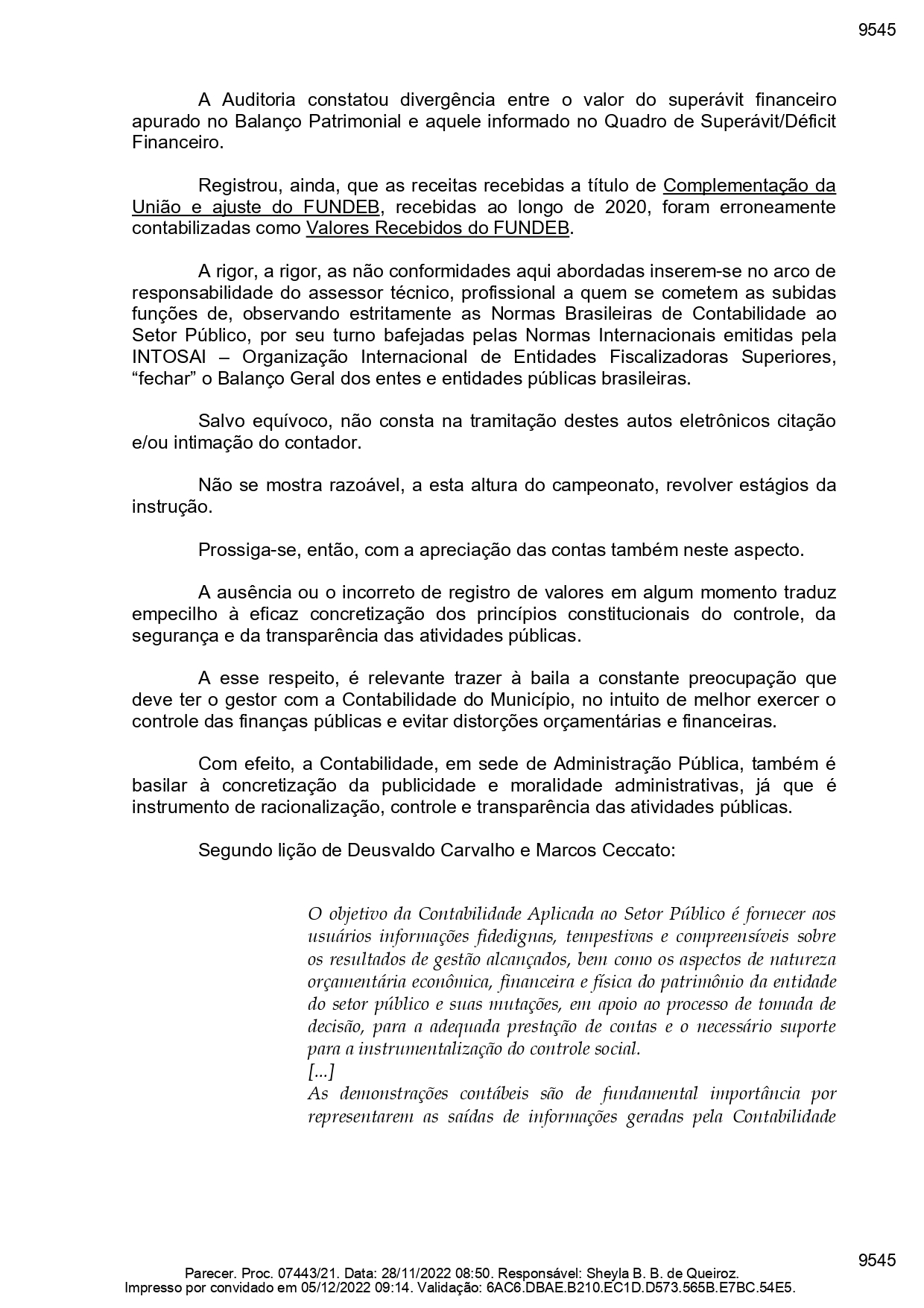 Em consulta ao site da Secretaria do Tesouro Nacional (STN) é possível obter que deste total, R$ 1.438.076,28 foram relativos a Ajuste, e, R$ 3.313.213,97 foram a título de Complementação da União. Como a gestão na apontou na defesa o valor, foi considerado que a irregularidade se manteve.