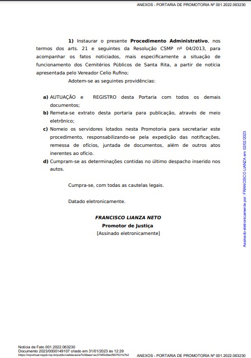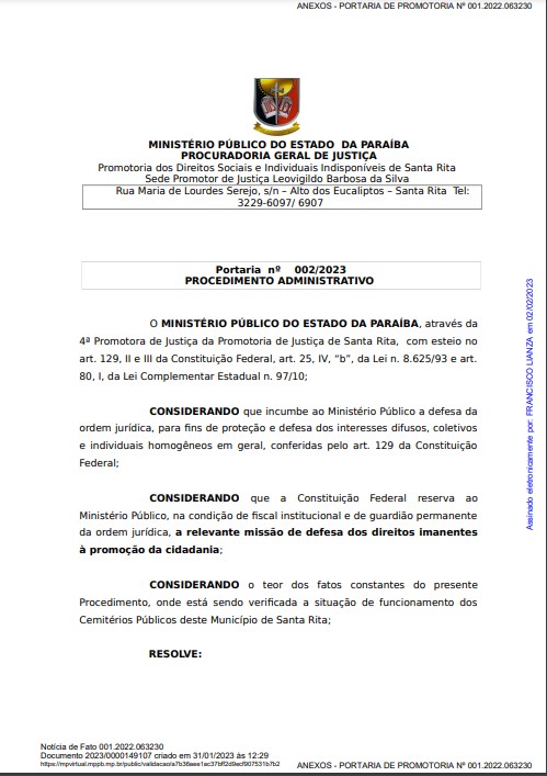 O Ministério Público do Estado do Paraíba ( MPPB) abriu procedimento administrativo para verificar o funcionamento dos Cemitérios Públicos de Santa Rita, a partir de notícia apresentada pelo vereador Celio Rufino (Podemos). A portaria foi publicada na edição desta quinta-feira (2) no Diário Oficial do MPPB e assinada pelo promotor de justiça Francisco Lianza Neto.