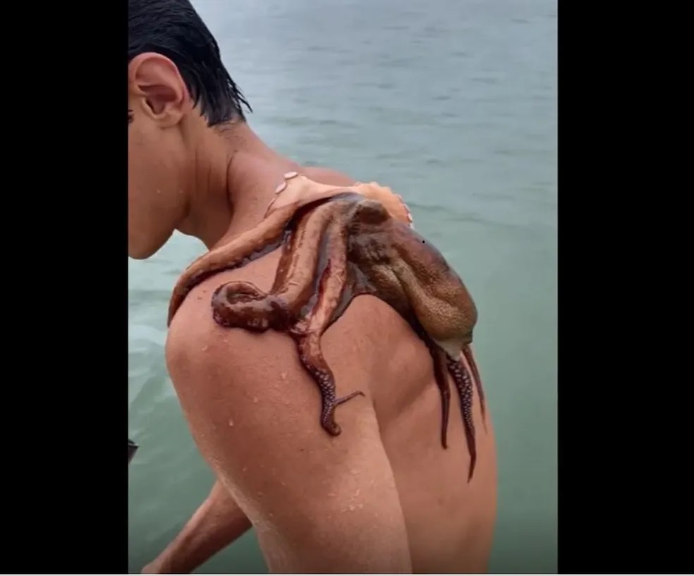 Jovem nada com polvo grudado nas costas e vídeo viraliza: ‘Um dos melhores dias da minha vida’