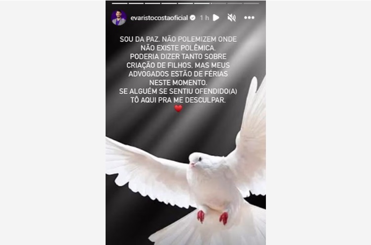Após os vídeos de Zé Felipe, Evaristo usou o story do Instagram para se desculpar. Segundo ele, não existe polêmica no assunto. “Sou da paz. Não polemizem onde não existe polêmica. Poderia dizer tanto sobre criação de filhos, mas meus advogados estão de férias neste momento. Se alguém se sentiu ofendido(a), estou aqui para me desculpar”, escreveu.