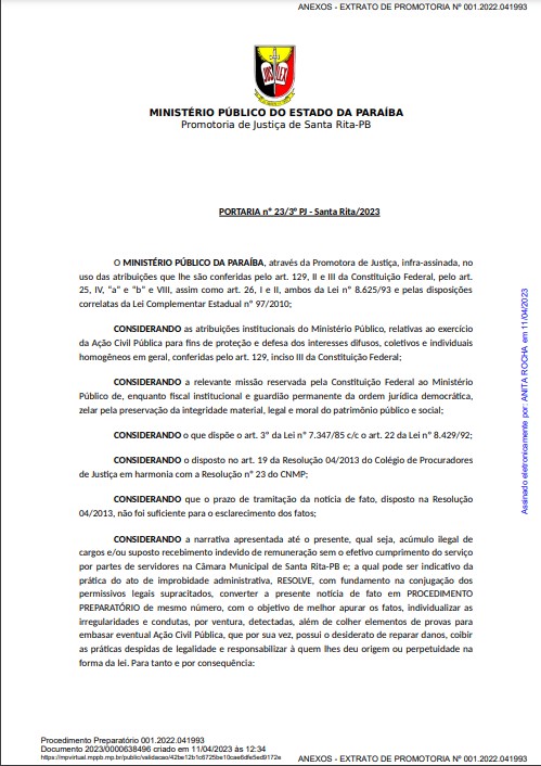 O Ministério Público da Paraíba, por meio da Promotoria de Justiça de Santa Rita, abriu um procedimento preparatório para investigar acúmulo de cargos e funcionários fantasmas na Câmara Municipal de Santa Rita.