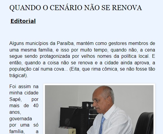 O Jornal online O Interiorano fez duras críticas a cena política das cidades de Sapé e Mari, em editorial publicado nesta quarta-feira (07) intitulado “Quando o cenário não se renova”. “Alguns municípios da Paraíba, mantém como gestores membros de uma mesma família, e isso por muito tempo, quando não, a cena segue sendo protagonizada por […]