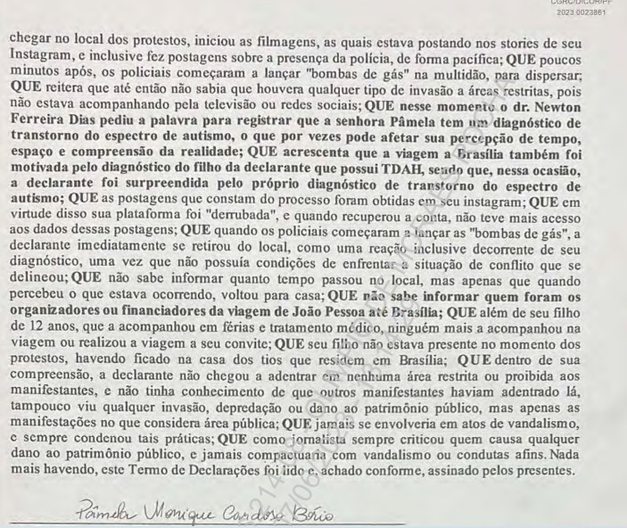 Ainda conforme o relatório recebido pelo ClickPB, Pâmela também informou que foi à Brasília naquela data devido ao diagnóstico de TDAH do filho, e que se surpreendeu após descobrir que é autista: “não possuía condições de enfrentar a situação de conflito que se delineou; que não sabe quanto tempo passou no local, mas apenas que quando percebeu o que estava ocorrendo, voltou para casa; que não sabe informar quem foram os organizadores ou financiadores da viagem de João Pessoa até Brasília”. Ela afirmou ainda que o garoto não estava presente no momento dos protestos e que ficou na casa dos tios que moram em Brasília.