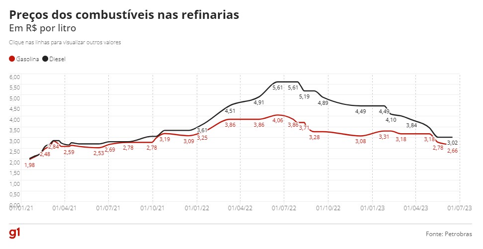 O litro da gasolina passa de R$ 2,78 para R$ 2,66, uma redução de 4,3%. A gasolina está no menor preço para as distribuidoras desde junho de 2021.