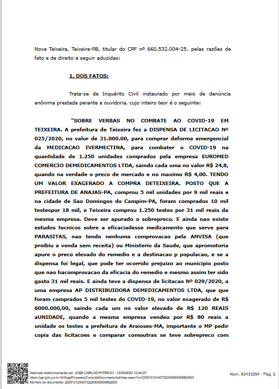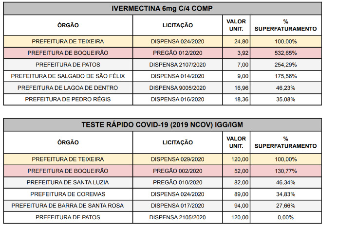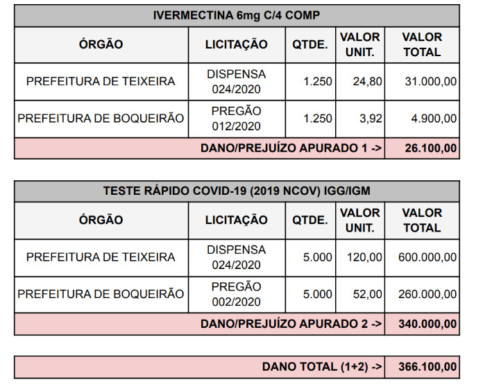 Ao longo do processo, ao comparar o valor pago no contrato para compra de invermectina com a da prefeitura de Boqueirão, também na Paraíba, o Ministério Público concluiu que houve um superfaturamento de mais de 500% no produto. “O percentual de superfaturamento encontrado em relação ao valor de aquisiçãoda Prefeitura de Teixeira foi de 532,65%”, diz trecho do conteúdo.