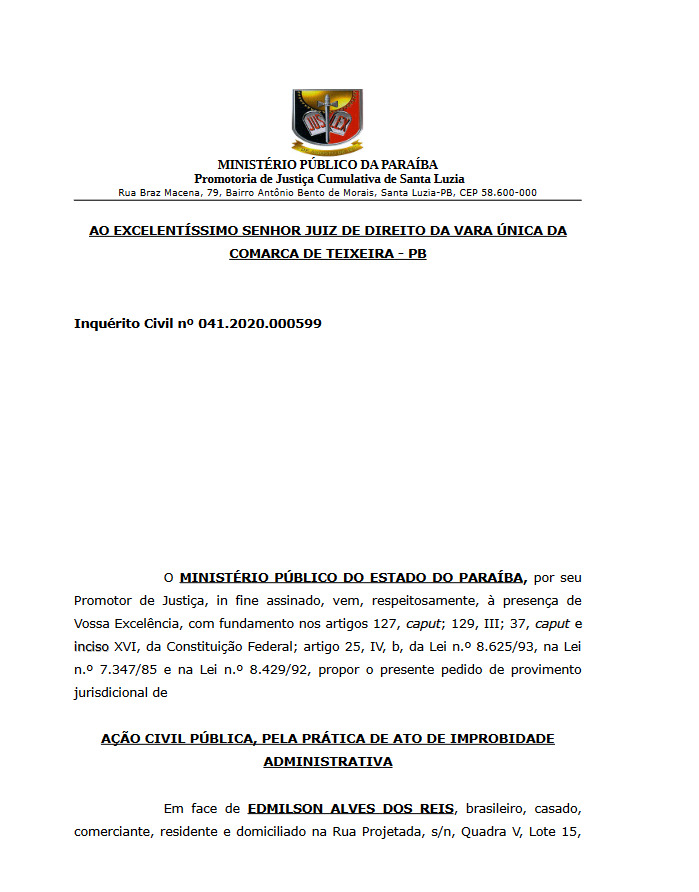 Com base nisto, o MP calculou um prejuízo ao erário de R$ 366.100,00 e pediu a imputação da improbidade administrativa do ex-gestor, além da devolução do valor. O processo, de quase 800 páginas, é assinado pelo promotor de justiça José Carlos Patrício, da Comarca de Texeira.