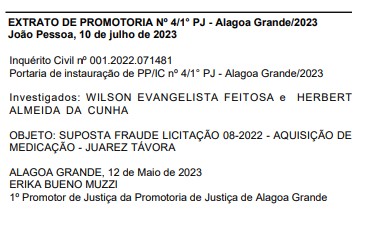 O Ministério Público da Paraíba (MPE), abriu um inquérito civil para apurar uma suposta fraude no processo licitatório de compra de medicamentos pela Prefeitura de Juarez Távora. A abertura do processo investigativo foi divulgada do diário oficial da instituição, na edição desta quarta-feira (12).