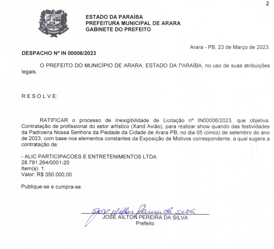 O município de Arara, na região do brejo paraibano deve desembolsar quase R$ 1 milhão apenas com os cachês dos artistas que vão se apresentar na ‘festa da padroeira’ 2023. Conforme apurou o ClickPB, do dia 05 ao dia 07 de setembro a gestão municipal vai realizar a festa de Nossa Senhora da Piedade, em praça pública, com dez atrações.