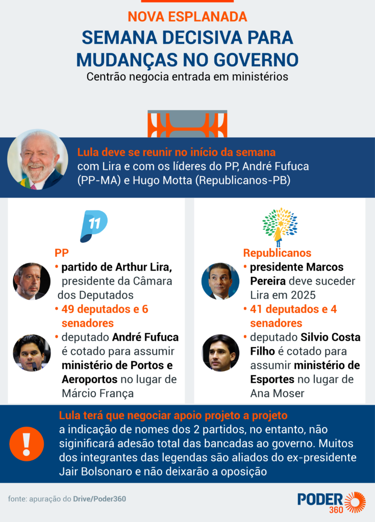 Segundo a matéria, Lula terá semana de conversas para decidir mudanças na Esplanada em reuniões com Arthur Lira (PP-AL), e líderes do PP, André Fufuca (MA), e do Republicanos, Hugo Motta (PB) Arthur Lira. Hugo concorre, com outro indicado do Republicanos, o deputado federal Silvio Costa, para o ministério dos Esportes. O atual presidente nacional da sigla, Marcos Pereira, planeja disputar a vaga de Arthur Lira a presidência da Câmara, em 2025.
