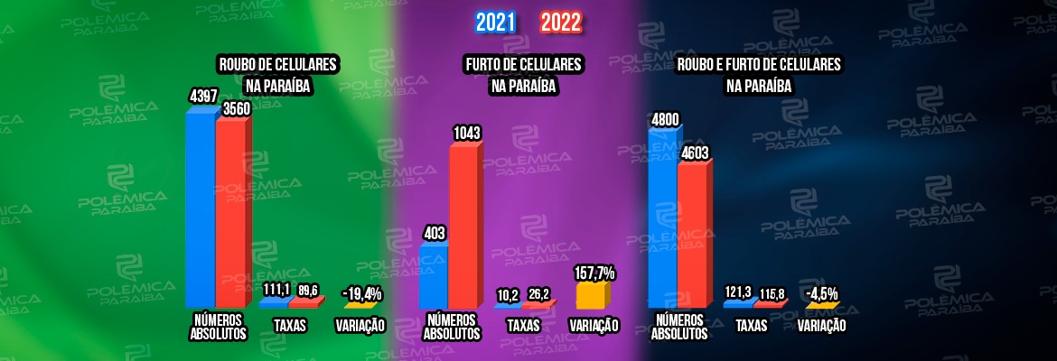De acordo com os dados divulgados, a Paraíba apresentou, em números absolutos em 2021, cerca de 403 furtos e em 2022 esse número deu um salto para 1.043. Em 2021 a taxa de furtos foi de 10,2 a cada 100 mil habitantes, e em 2022 esse número subiu para 26,2 totalizando uma variação de 157,7% no número de furtos só na Paraíba.