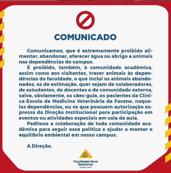 A faculdade Facene/Famene, em João Pessoa, publicou uma nota nas redes sociais, nessa terça-feira (05), proibindo a comunidade acadêmica e também visitantes de darem comida e água aos animais que estiverem nas dependências da instituição. Conforme apurou o ClickPB, a decisão da diretoria do Campus gerou revolta entre protetores.