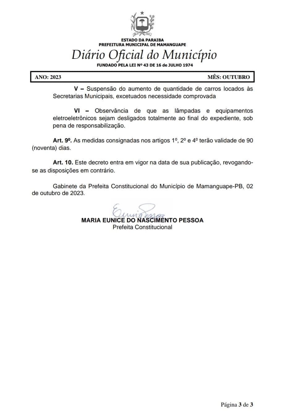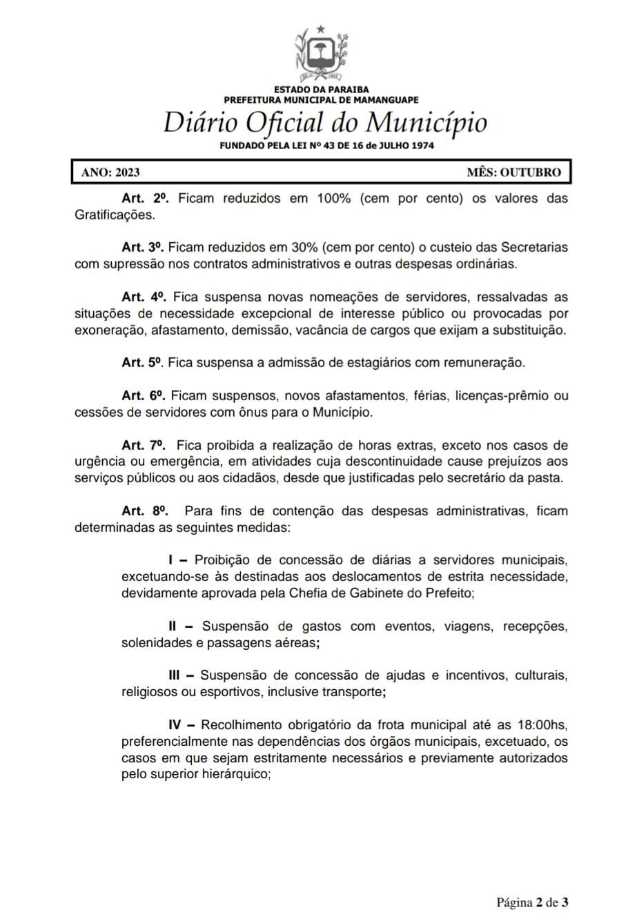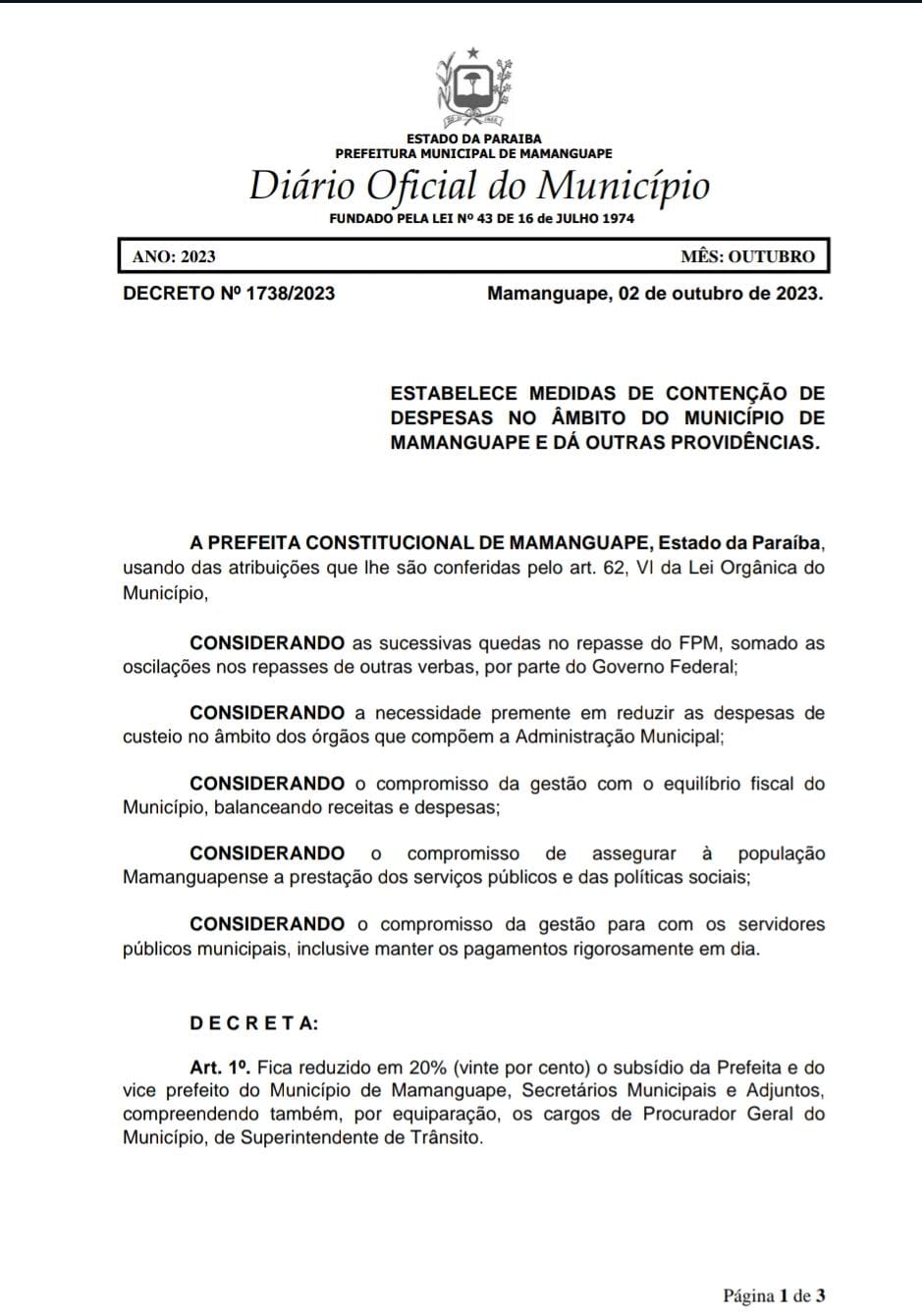 Mais uma prefeitura da Paraíba resolveu anunciar medidas de ‘contenção de gastos’ alegando queda no Fundo de Participação dos Municípios (FPM). Conforme apurou o ClickPB, em decreto publicado ontem (02), a prefeitura de Mamanguape, no Litoral Norte do estado, oficializou a redução de salários do alto escalão, suspensão de novas nomeações e gratificações e outras medidas de corte de custos.