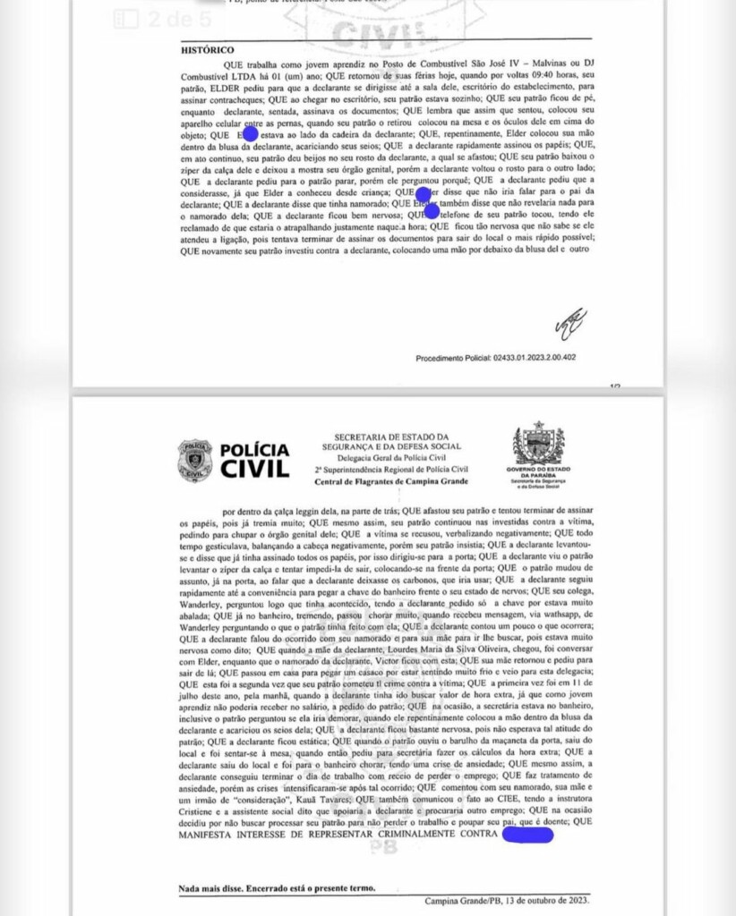 Conforme boletim de ocorrência assinado pela delegada Maria Socorro Barbosa Fausto, a jovem relatou que tinha voltado de férias, quando foi chamada pelo empresário para comparecer ao escritório dele sob pretexto de assinar contra cheques atrasados. “Meu patrão começou acariciando meus seios, depois quis me beijar e ainda chegou a abrir o zíper e mostrar o órgão genital. Eu disse que tinha namorado e ele insistindo”, disse a jovem em declaração à Polícia Civil de Campina Grande.