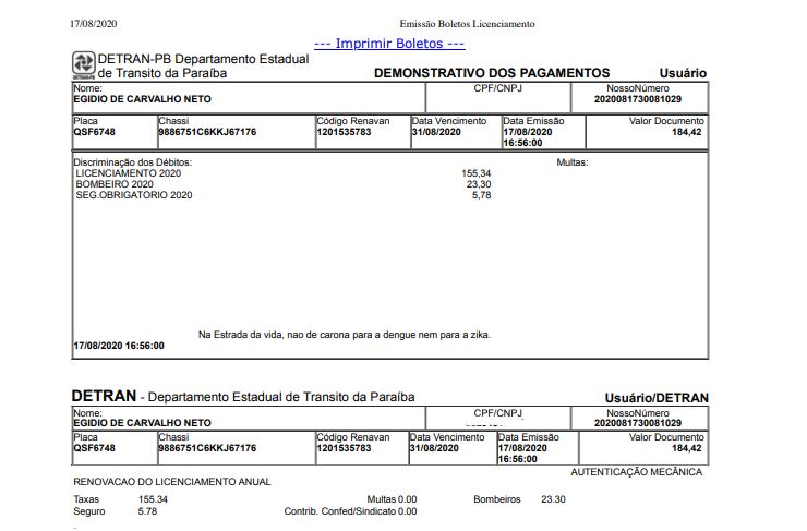 Esse veículo está em nome do padre Egídio, que incluiu o pagamento do imposto de licenciamento às despesas do Hospital Padre Zé. Como mostra o documento: