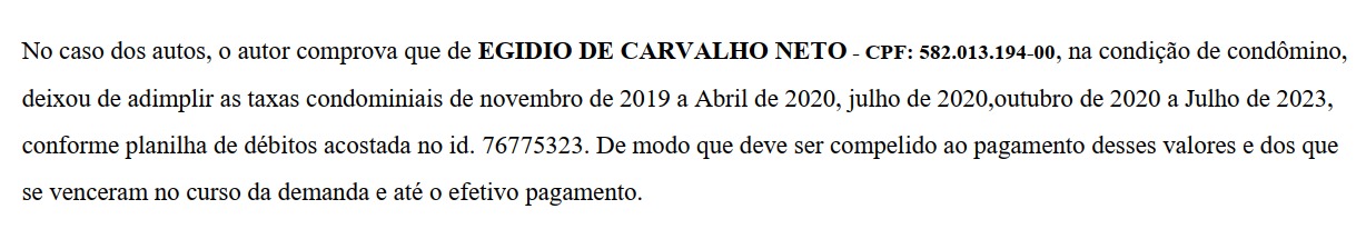 A Justiça da Paraíba condenou o Padre Egídio (Egidio de Carvalho Neto) ao pagamento de mais de R$ 50 mil referentes a taxa de condomínio de um apartamento no residencial de alto padrão Magnific Tambaú Home Service. A decisão é do juíz Meales Medeiros de Melo. Conforme obtido pelo jornalista Clilson Júnior, nesta segunda-feira (6), a ação foi julgada procedente em 1ª instância.