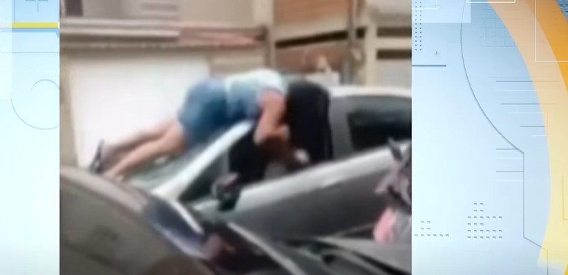 Mulher flagra marido com suposta amante e pula em capô de carro – VEJA VÍDEO