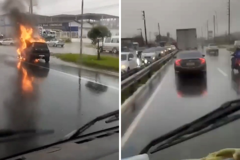 VÍDEO: carro pega fogo e é destruído na BR-101; trânsito fica lento
