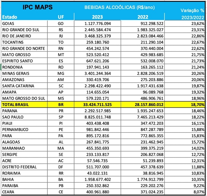 Dados do IPC Maps, especializado em potencial de consumo, indicam que, em 2023, as famílias brasileiras gastaram cerca de R$ 33,4 bilhões em bebidas alcoólicas, o que representou um acréscimo de 18,7% em relação ao ano anterior, quando as despesas somaram R$ 28,1 bilhões. Só no Estado de São Paulo, mais de R$ 8,8 bilhões foram desembolsados no ano passado, contra R$ 7,4 bilhões em 2022, o que equivale a uma alta de 18,2%, vide tabela abaixo: