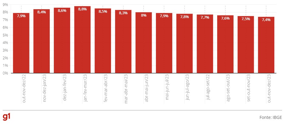 O Brasil encerrou o trimestre terminado em dezembro com taxa de desemprego em 7,4%, patamar mais baixo para o período desde 2014 e com recorde histórico de trabalhadores ocupados. No trimestre anterior, a taxa de desocupação era de 7,7%.