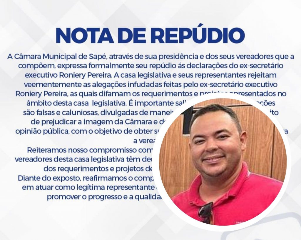 REVOLTA: Câmara de Sapé emite nota de repúdio à ex-secretário Roniery Pereira que criticou atuação de parlamentares