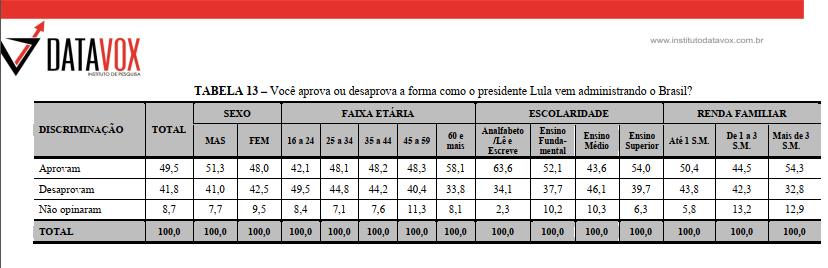 De acordo com o levantamento, a aprovação do governo petista aparece maior entre os eleitores do sexo masculino (51,35) e entre àqueles com 60 anos ou mais (58,1%)