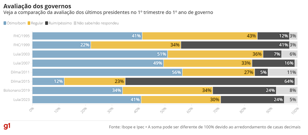 Na comparação com o mesmo período de outros governos, a avaliação de ótimo ou bom da atual gestão de Lula é melhor do que a de Collor, em 1992 (14%), de Itamar Franco, em 1993 (21%), do segundo mandato de Fernando Henrique Cardoso, em 2000 (20%), e do segundo mandato de Dilma, em 2016 (10%).