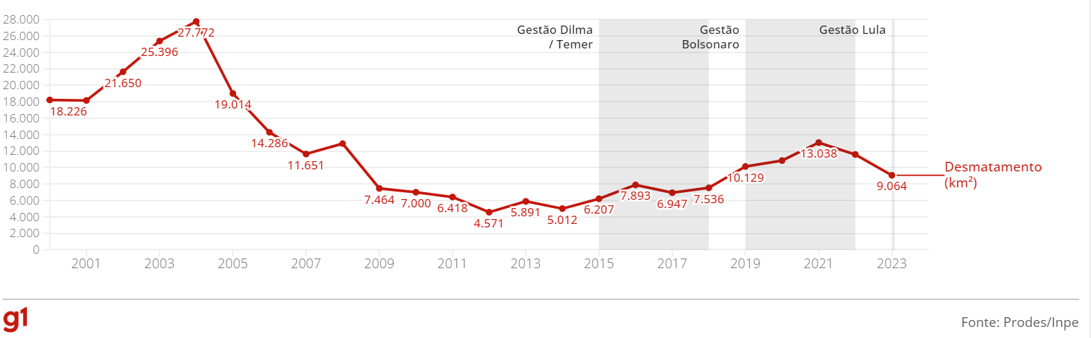 O número só voltou a cair no último ano da gestão de Jair Bolsonaro (PL), atingindo a marca de 11.594 km². Bolsonaro, porém, assumiu o governo com uma taxa inicial de desmatamento em torno de 7.500 km², a qual não apresentou reduções quando comparada com o índice do começo do seu mandato.