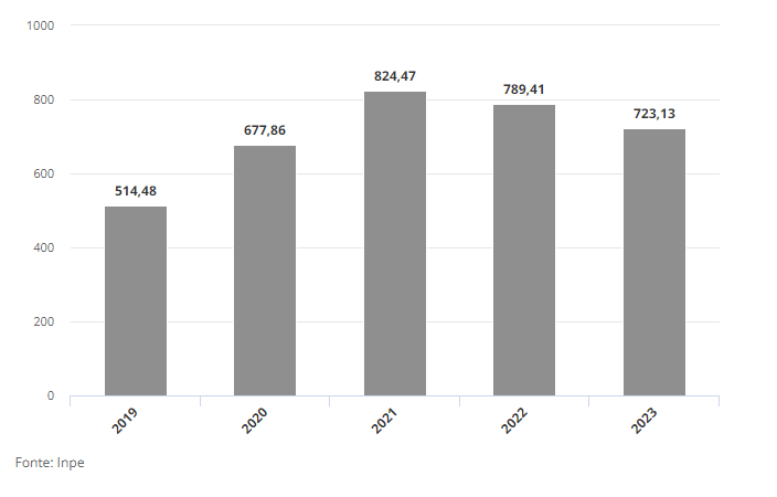 Em 2023 (agosto de 2022 a julho de 2023), foram desmatados 723,13 km², enquanto em 2022 (agosto de 2021 a julho de 2022) esse número foi de 789,41 km² (veja gráfico abaixo).