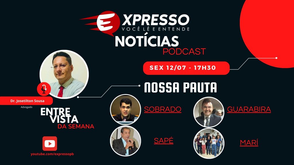 O PodCast EXPRESSO NOTÍCIAS desta sexta-feira (12) pauta os bastidores da política em Sobrado, Sapé, Guarabira e Marí. O advogado Dr. Joseilton Sousa discute a legislação eleitoral. Assista ao vivo abaixo ou acesse aqui nosso canal no youtube: Redação/ExpressoPB