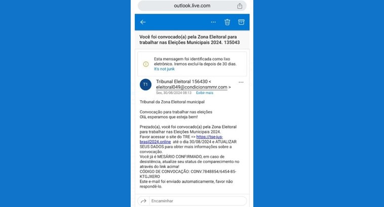 O Tribunal Regional Eleitoral da Paraíba (TRE-PB) alerta para um suposto golpe formatado para captar dados pessoais, usando o nome da Justiça Eleitoral. A mensagem falsa enviada por e-mail notifica sobre a necessidade de acessar um link fraudulento, supostamente do Tribunal Superior Eleitoral (TSE), para obter informações sobre a convocação de mesárias e mesários. O […]