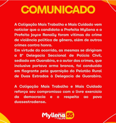 Coligação Mais Trabalho e Mais Cuidado publicou sem suas redes sociais a informação de que a candidata a prefeitura Myllena e a Prefeita Joyce Renally foram vítimas do crime de violência política de gênero, além de outros crimes contra honra.