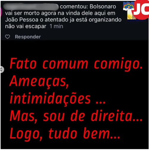 Na manhã desta quinta-feira (17), o ex-presidente Jair Bolsonaro (PL) utilizou suas redes sociais para compartilhar uma captura de tela de uma ameaça que recebeu. Em um comentário, um usuário afirmou: “Bolsonaro vai ser morto agora na vinda dele aqui em João Pessoa. O atentado já está organizado; não vai escapar.” Em resposta, Bolsonaro destacou que ameaças e intimidações são comuns em sua trajetória política, afirmando: “Mas sou de direita… Logo, tudo bem…”
